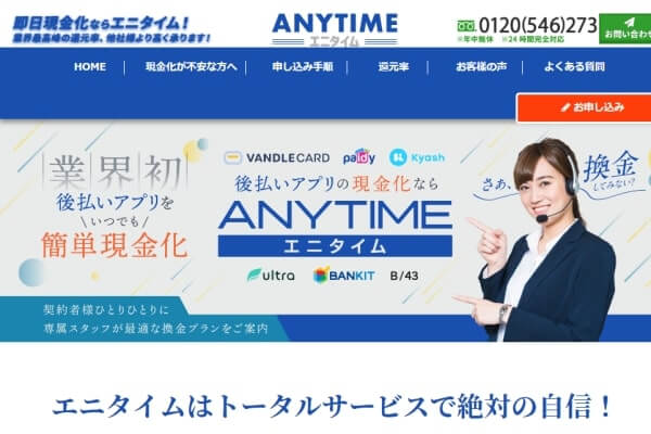 - エニタイムは老舗の現金化業者で、クレジットカード現金化業者の中でも信頼が厚いため安心感で選ぶなら第一候補と言えるでしょう。 また、換金率に関しても初回90%・2回目以降87%~と申し分のない数値なので損することなく現金化ができます。 入金時間に関しても最短10分で指定の銀行口座に振り込まれるのでストレスなく取引が可能です。