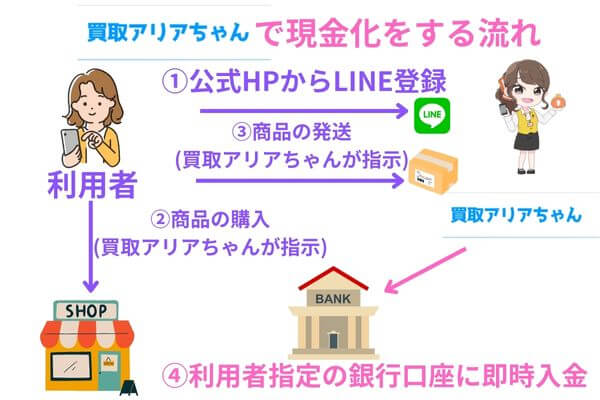 • 買取アリアちゃんで現金化を行う流れ