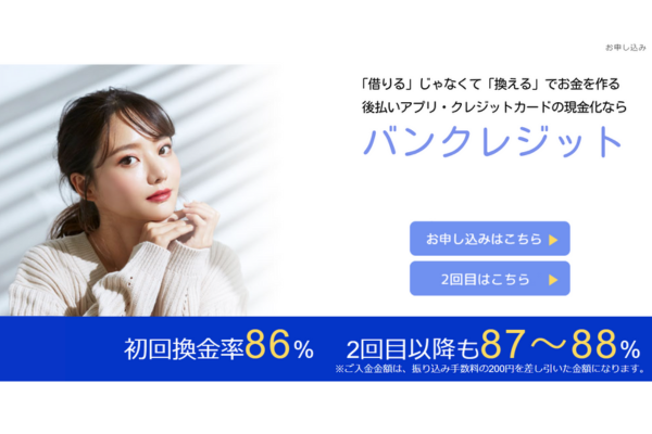 バンクレジットは換金率86%~と高条件で利用できますので、詳しい手順やどんな業者か知りたい方は下記のページをチェックしてみてください。